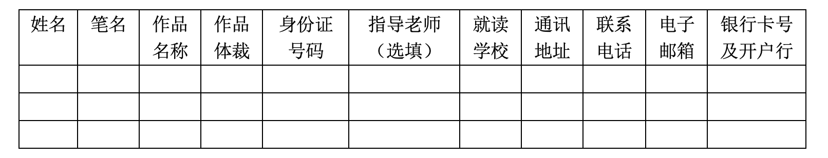 4.参评作者须在截止时间之前将参评作品电子版(标题为宋体加粗或方正小标宋二号、正文为仿宋或宋体三号)、《信息表》(均为word文档格式)和学生证(或校园出入证)、身份证照片以附件形式发送至邮箱:fjszxzw@sina.com,邮件主题和作品文档名均请设为:校园文学征集活动+组别+作品名称+作者姓名,信息表需填写完整;不接受纸质投稿。不符合以上投稿要求的作品不予受理。《信息表》可至福建文艺网下载。