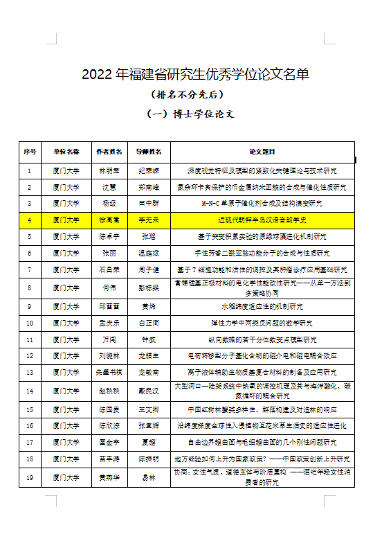 我系李无未教授指导的博士毕业生徐高嵩的博士学位论文《近现代朝鲜半岛汉语音韵学史》入选2022年福建省优秀博士学位论文;我系王宇教授指导的硕士毕业生孙娜的硕士学位论文《茂腔和莫言笔下的女性形象》入选2022年福建省优秀硕士学位论文。
