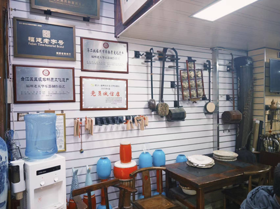 随后,实践队来到老天华乐器店,拜访了茶亭十番音乐的非遗传承人——王增鑫先生。王师傅不仅是老天华乐器店的第六代掌门人,还是台江区茶亭十番音乐研究会副会长、茶亭十番乐团成员以及福州市艺术学校教授茶亭十番音乐的特聘老师。王师傅向队员们讲述了茶亭十番音乐的历史渊源及发展历程。在现场欣赏茶亭十番音乐后,队员们深刻地领略到了茶亭十番音乐的独特韵味。实践队员还向王师傅询问了茶亭十番音乐的发展现状及传承问题,了解到茶亭十番音乐虽面临着与其他传统音乐相似的困境,但在非遗传承人的坚守下,不断有新鲜血液注入到传承队伍中,已成立近二十年的福州市台江区第四中心小学茶亭十番音乐少儿培训基地就是一个非常好的例子。在社会各界的努力下,茶亭十番音乐文化的种子得以播撒到福州这片有福之州上,这让实践队员深刻感受到了非遗技艺生生不息的文化活力。